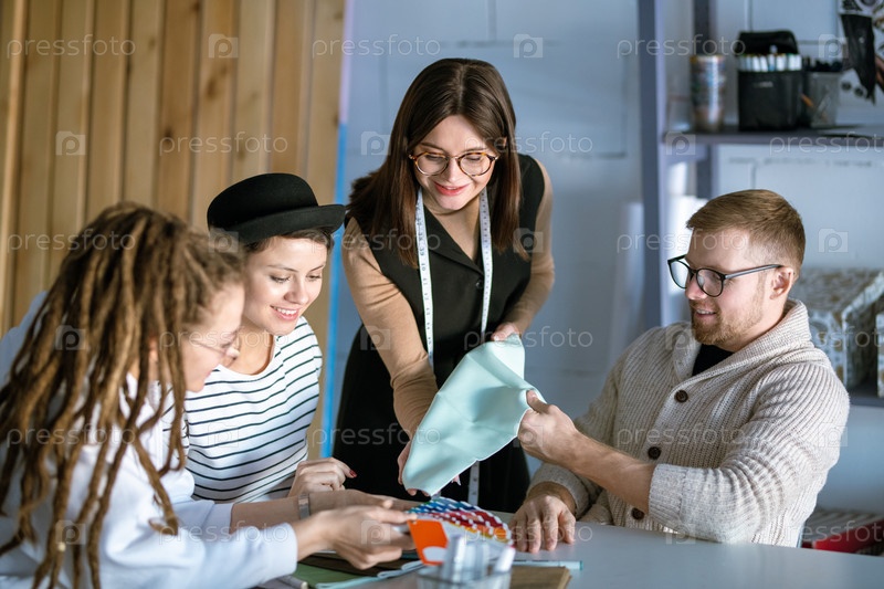 Группа молодых дизайнеров обсуждает образцы текстиля во время работы в студии