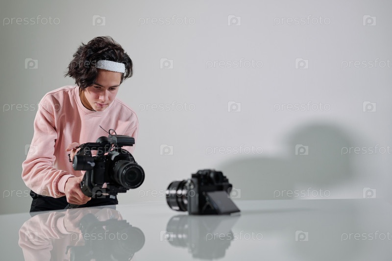 Молодой серьезный видеоблоггер стоит перед новым фотооборудованием на столе