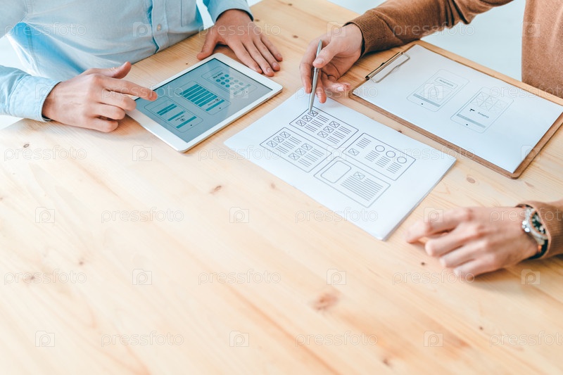 Два молодых высокотехнологичных дизайнера работают над программным обеспечением для смартфонов на рабочем месте