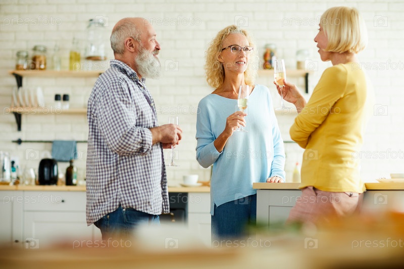 Веселые друзья пьют шампанское на кухне