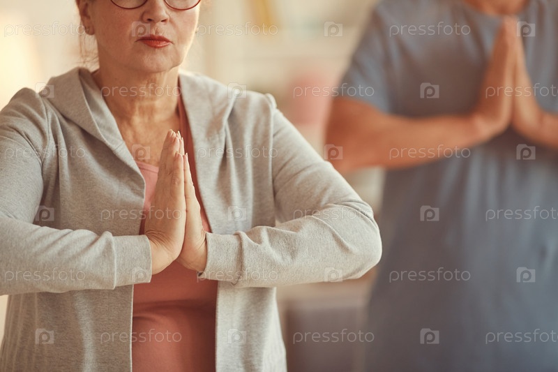 Близкий план спокойной старшей женщины в спортивной рубашке, держащейся за руки в мудре во время достижения осознанности с медитацией на занятиях йогой