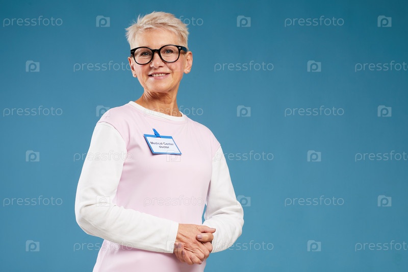 Портрет счастливой уверенной в себе умной медицинской специалистки-женщины в форме, стоящей на синем фоне