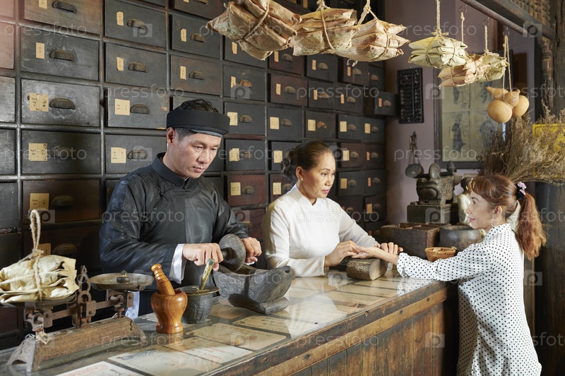 Женщина посещает старую китайскую аптеку