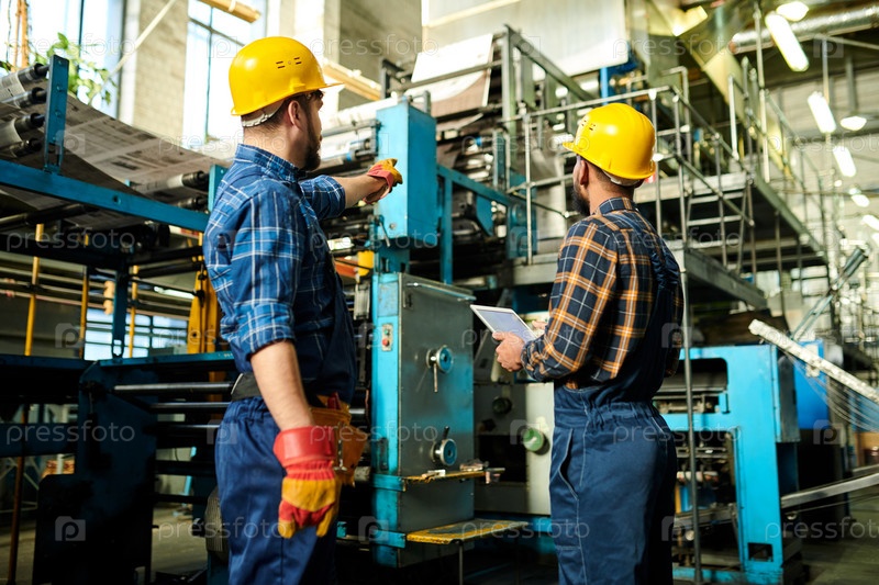 Задний вид фабричных рабочих в жестких шляпах, стоящих у промышленной машины и обсуждающих процесс печати при одновременном контроле печатания газеты