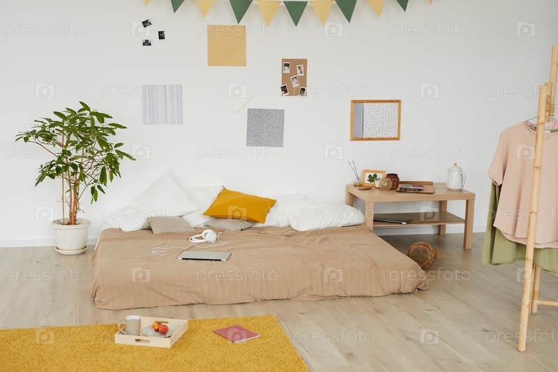 Интерьер современной спальни со стенами, украшенными фотографиями и картинками, беспорядок в комнате