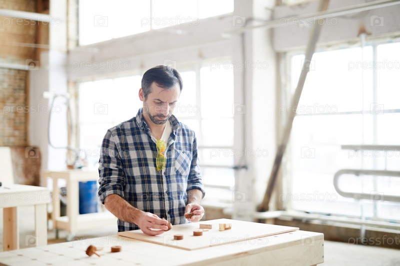 Загруженный рабочий сравнивает мелкие деревянные детали