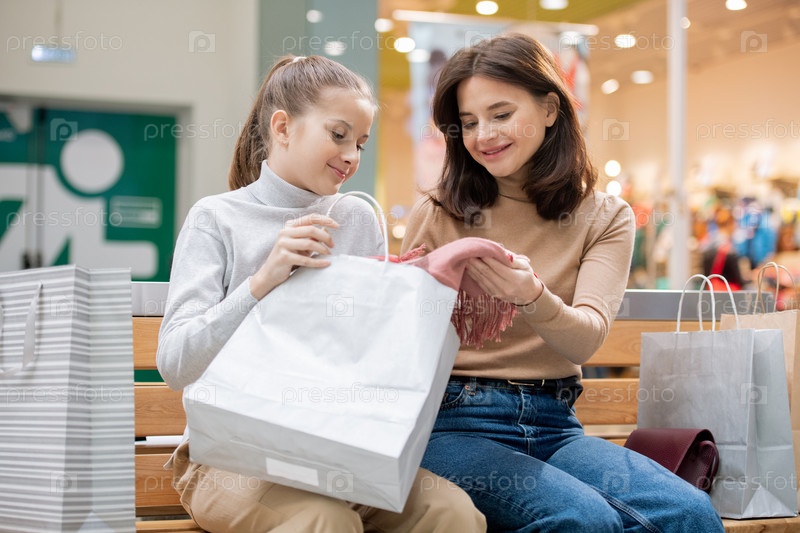 Милая девочка и ее мать обсуждают новый розовый шарф, который они купили на распродаже