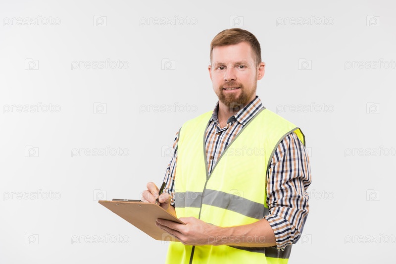 Счастливый молодой бородатый инженер с книжной доской и ручкой делает рабочие заметки