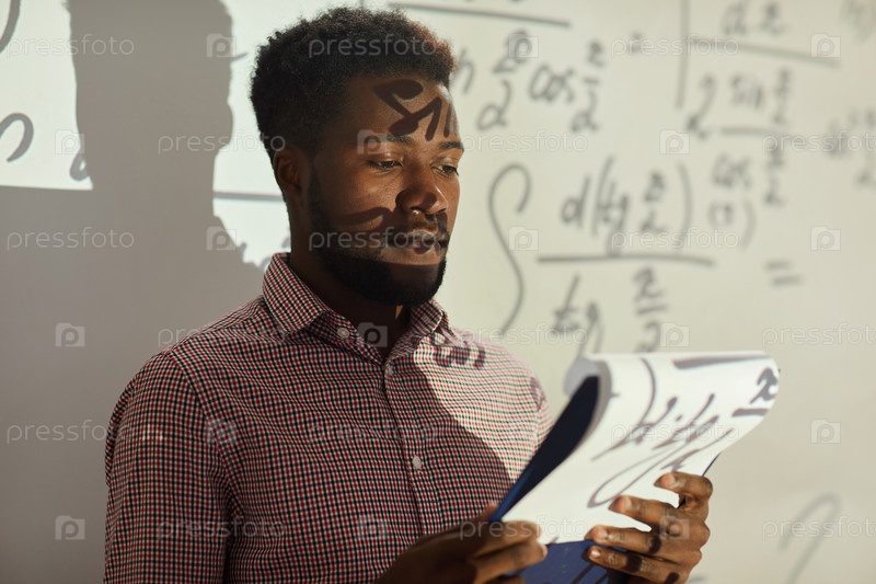 Серьезный молодой афроамериканский студент в непринужденной рубашке стоит перед проекционным экраном и представляет отчет по математике на университетском занятии