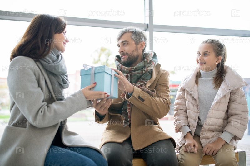 Муж в повседневной одежде дарит жене синий подарочный ящик с рождественским подарком