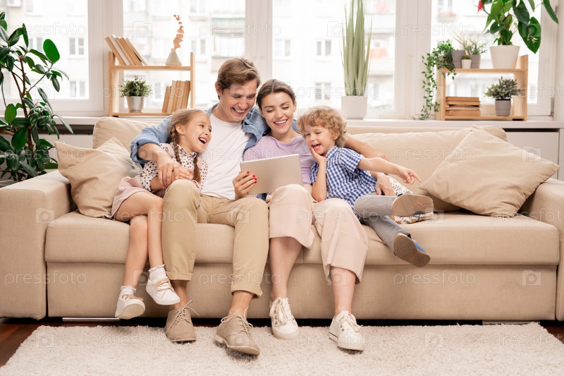 Молодая радостная случайная семья из двух детей и пары, смотрящая смешное видео