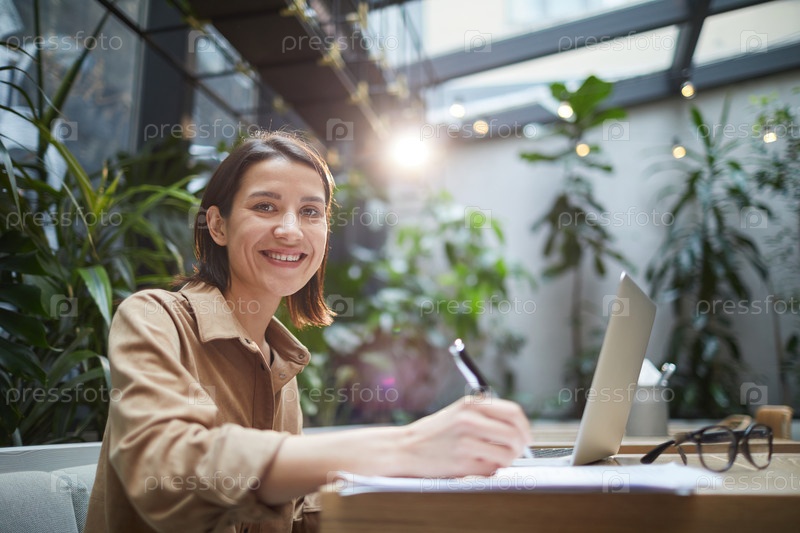 Улыбающаяся предпринимательница в открытом кафе