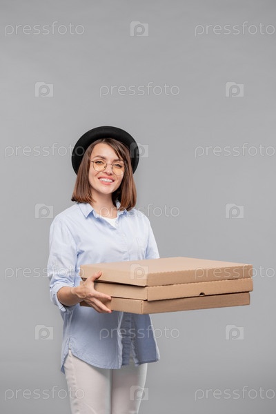 Счастливая молодая случайная женщина со стопкой картонных пакетов