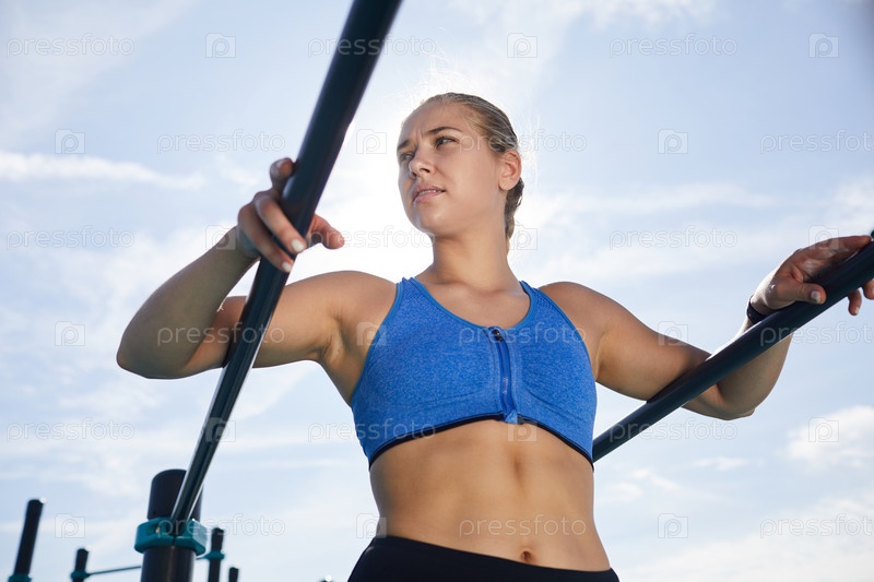 Ниже вид мотивированной молодой женщины в синем тесном бюстгальтере, которая опирается на параллельные решетки и смотрит вокруг на спортивную площадку