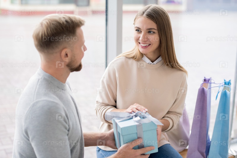 Счастливая женщина передает подарочный ящик своему мужу или парню после покупок