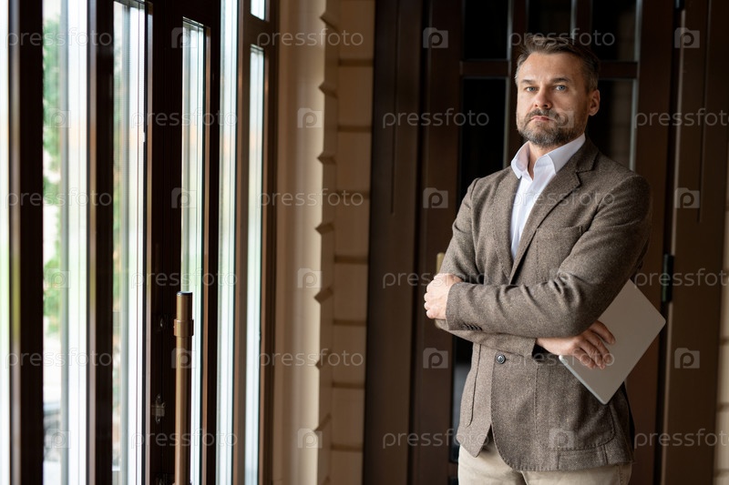Серьезный лидер средних лет с планшетом смотрит на вас, стоя у окна