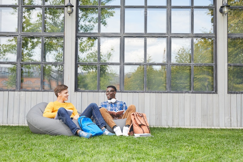 Два веселых студента отдыхают на свежем воздухе