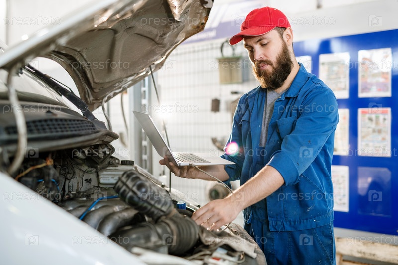 Серьезный молодой техник держит ноутбук и смотрит на детали двигателя