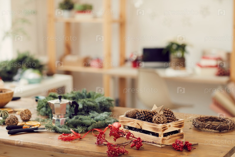 Сосредоточьтесь на деревянном столе с рождественскими украшениями и ручным инструментом, используемым для изготовления венка в современной мастерской