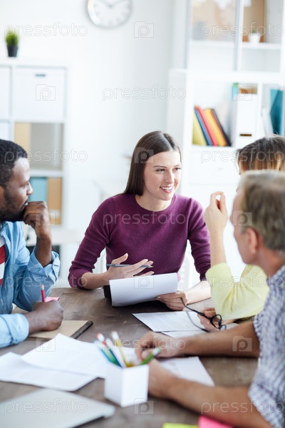 Взволнованные мультиэтнические деловые коллеги, сидящие за столом в офисе и обсуждающие стратегию на встрече