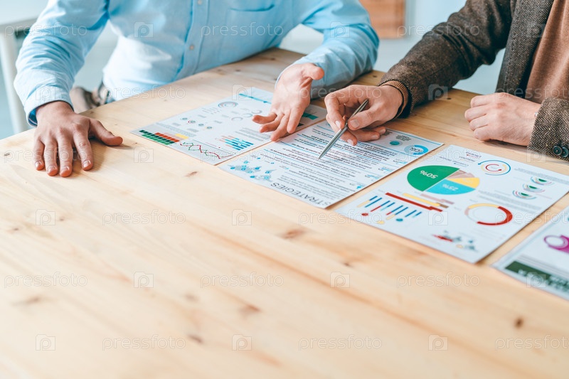 Два молодых бизнесмена сидят за деревянным столом и обсуждают документы