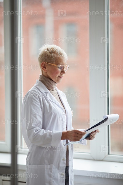 Женщина-врач, держащая клипборд у окна