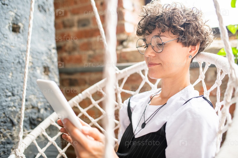 Молодая женщина с беспроводным гаджетом смотрит на дисплей во время просмотра онлайн-видео