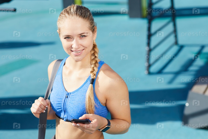 Портрет улыбающейся красивой девушки с блондинкой, стоящей на спортивной площадке и использующей современные гаджеты во время тренировок на свежем воздухе