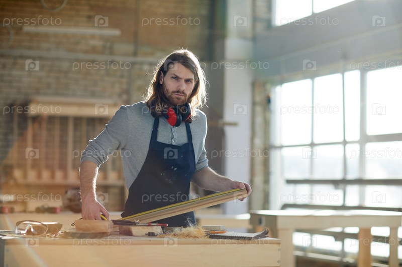 Серьезный хмурый молодой плотник в фартуке, стоящий за столом и использующий линейку во время измерения деревянной доски, он смотрит на камеру