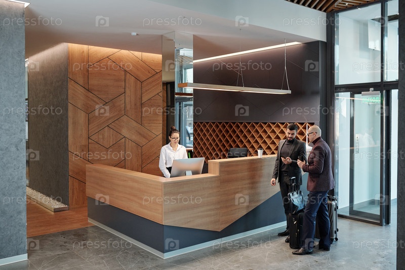Два элегантных бизнесмена с багажом, использующие смартфоны в гостиничном салоне