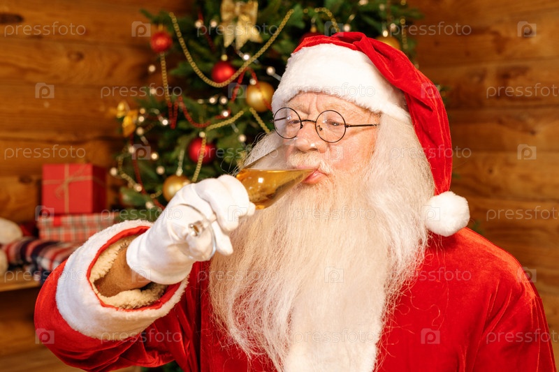Санта-Клаус пьет шампанское во время празднования Рождества в конце декабря