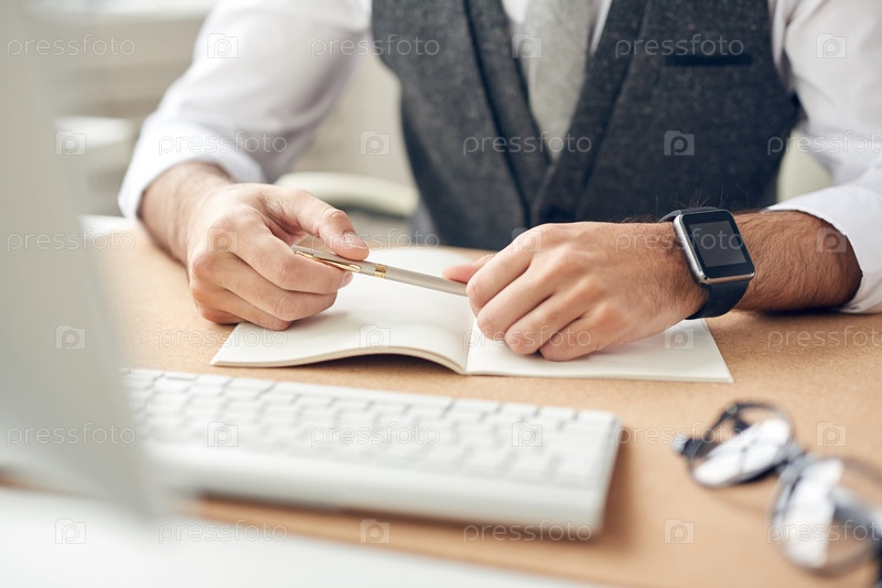 Близкий план неузнаваемого менеджера с дорогими наручными часами, сидящего за столом и вращающего ручку во время размышлений о бизнес-плане