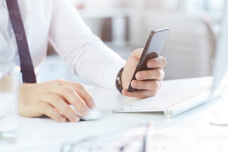 Близкий план неузнаваемого бизнесмена в формальной рубашке, сидящего за столом и проверяющего смартфон во время работы в офисе
