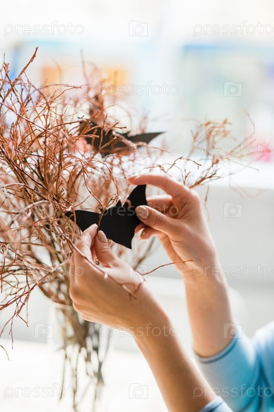 Руки женщины с черной рукодельной битой у сухих ветвей, украшающих ее дом