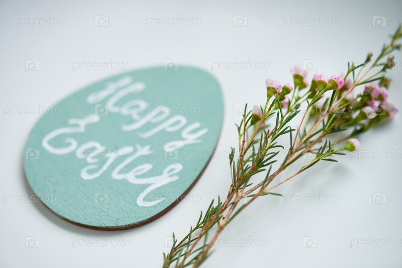 Пасхальное пожелание на открытке и зеленая весенняя ветвь на белом фоне