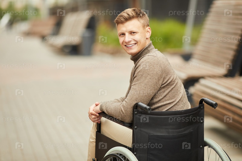 Портрет улыбающегося красивого молодого мужчины-инвалида в коричневом свитере, сидящего на инвалидной коляске