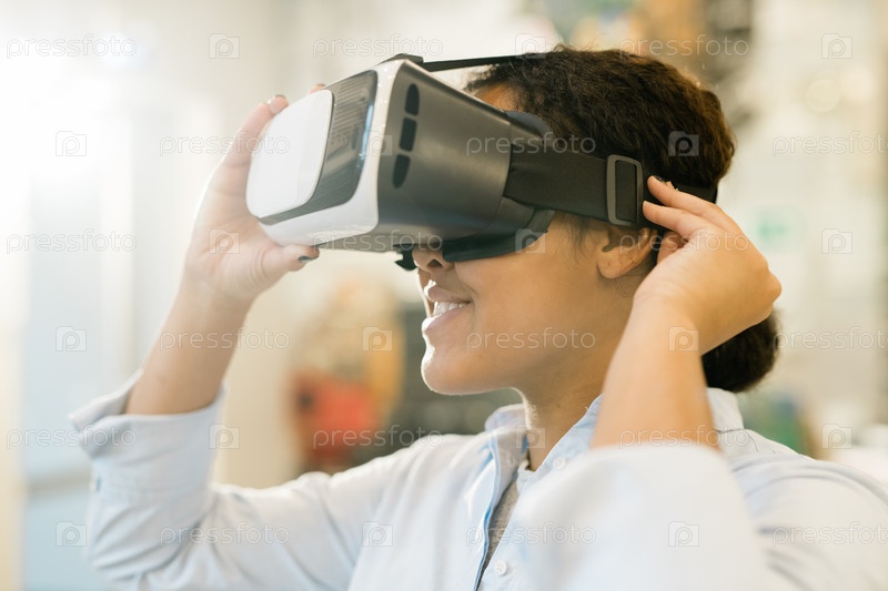 Молодая женщина смешанной расы надевает VR-гарнитуру на голову, чтобы посмотреть презентацию