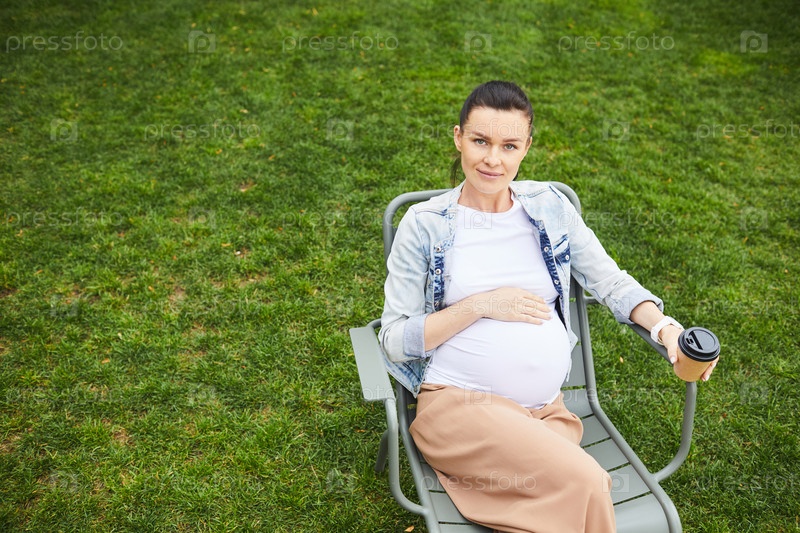 Беременная женщина расслабляется с кофейным напитком