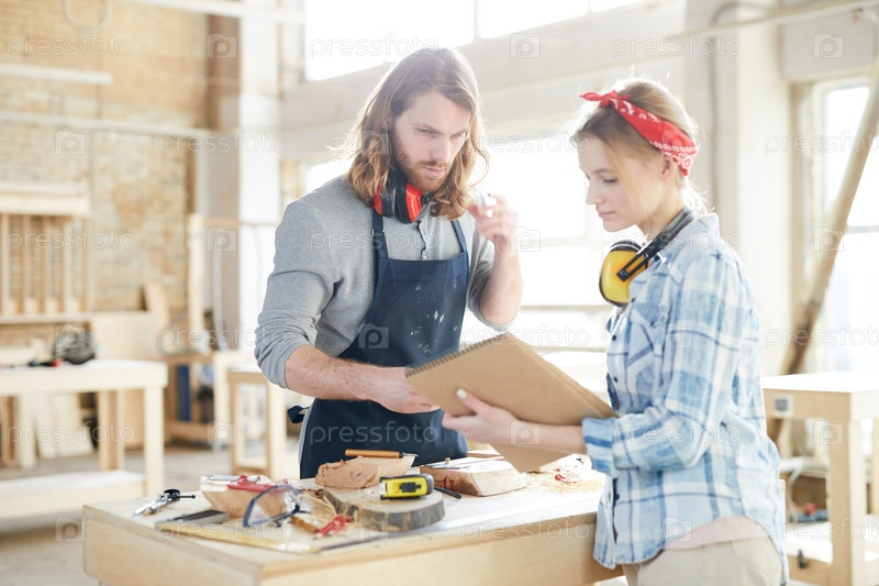 Серьезные обдуманные плотники с защитниками для ушей на шее стоят в мастерской и смотрят эскиз, разговаривая о изготовлении деревянных деталей
