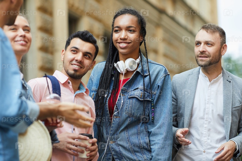 Группа позитивных молодых мультиэтнических друзей в повседневной одежде, стоящих на городской улице и разговаривающих вместе