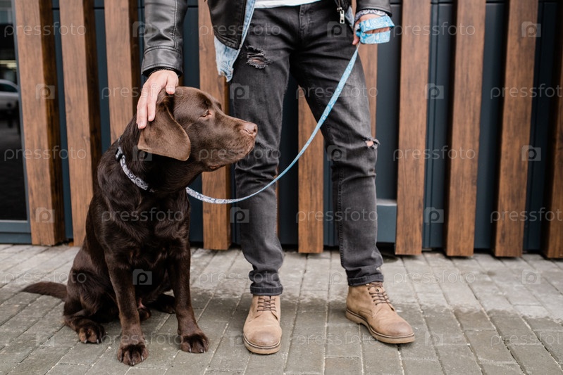 Молодой человек в черных джинсах, касающийся головы и своего милого коричневого питомца во время отдыха