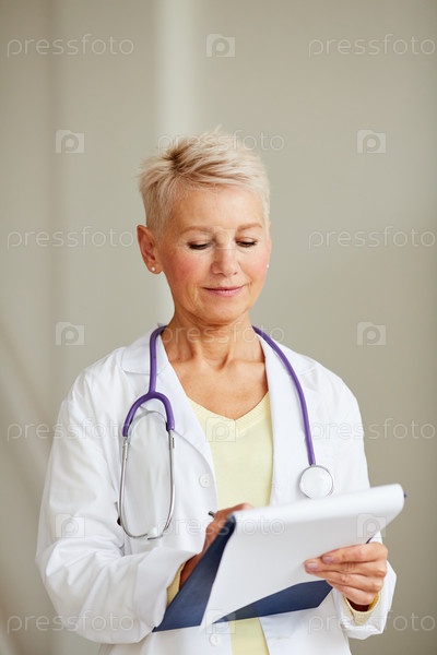 Красивая женщина-врач в лабораторном халате, которая носит стетоскоп вокруг шеи и заполняет медицинские записи во время обследования