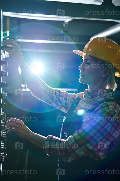 Концентрированная профессиональная женщина-оператор машины в жесткой шляпе, регулирующая ручки на панели управления во время работы в темном фабричном магазине