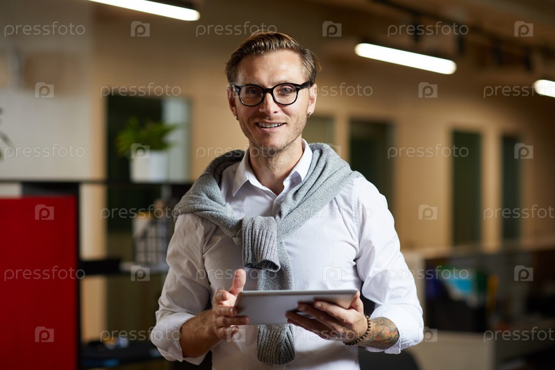 Портрет веселого модного молодого человека в белой рубашке и очках, использующего цифровой планшет в современном офисе