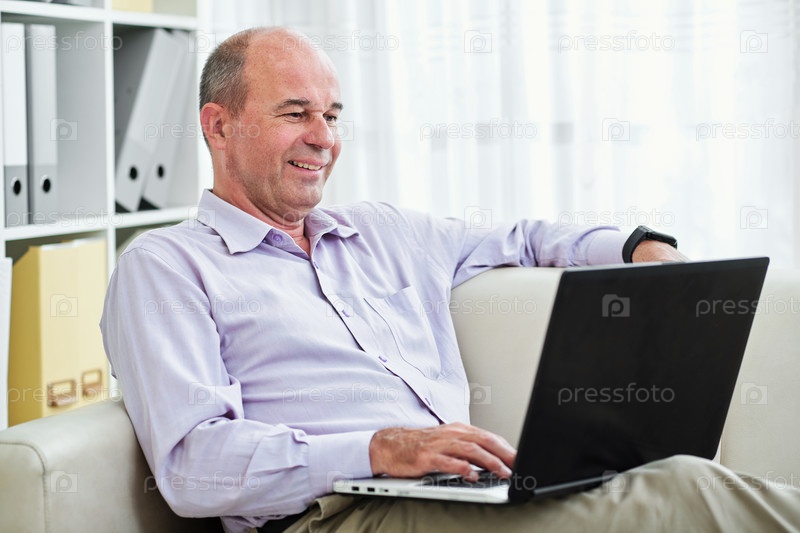 Улыбающийся бизнесмен читает электронные письма