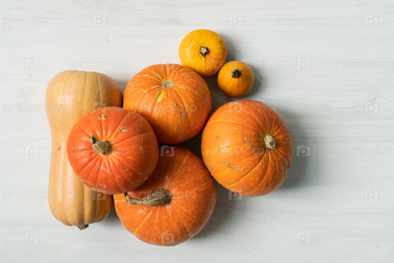 Куча больших оранжевых тыквен и двух желтых маленьких на белом фоне