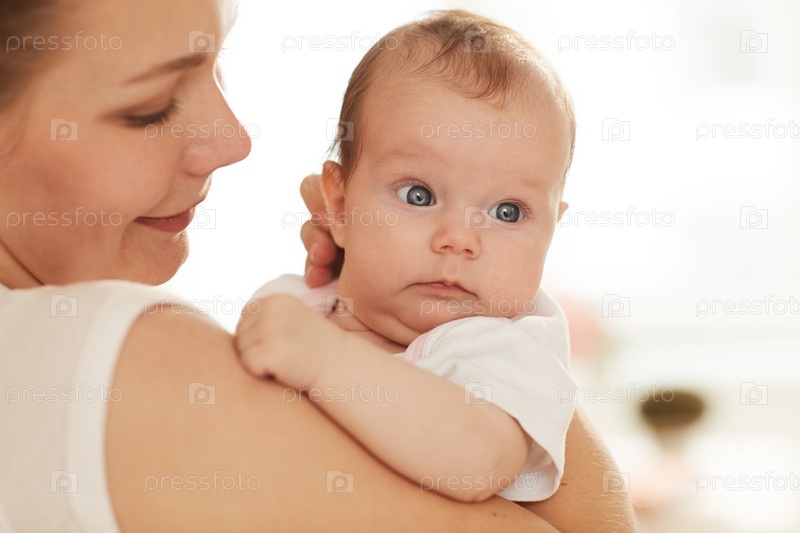 Счастливая, улыбающаяся молодая мать смотрит нежно на своего ребенка с большими голубыми глазами, которого она держит в руках