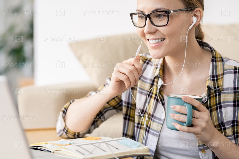 Веселый удаленный менеджер отвечает на онлайн-звонки с помощью наушников