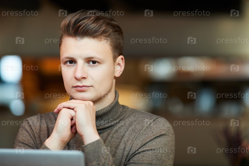 Портрет серьезного молодого красивого мужчины в коричневом свитере, сидящего в кафе и опирающегося головой на руки