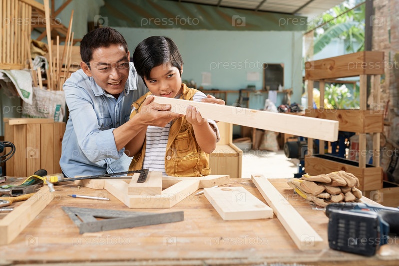 Отец учит сына деревообработке